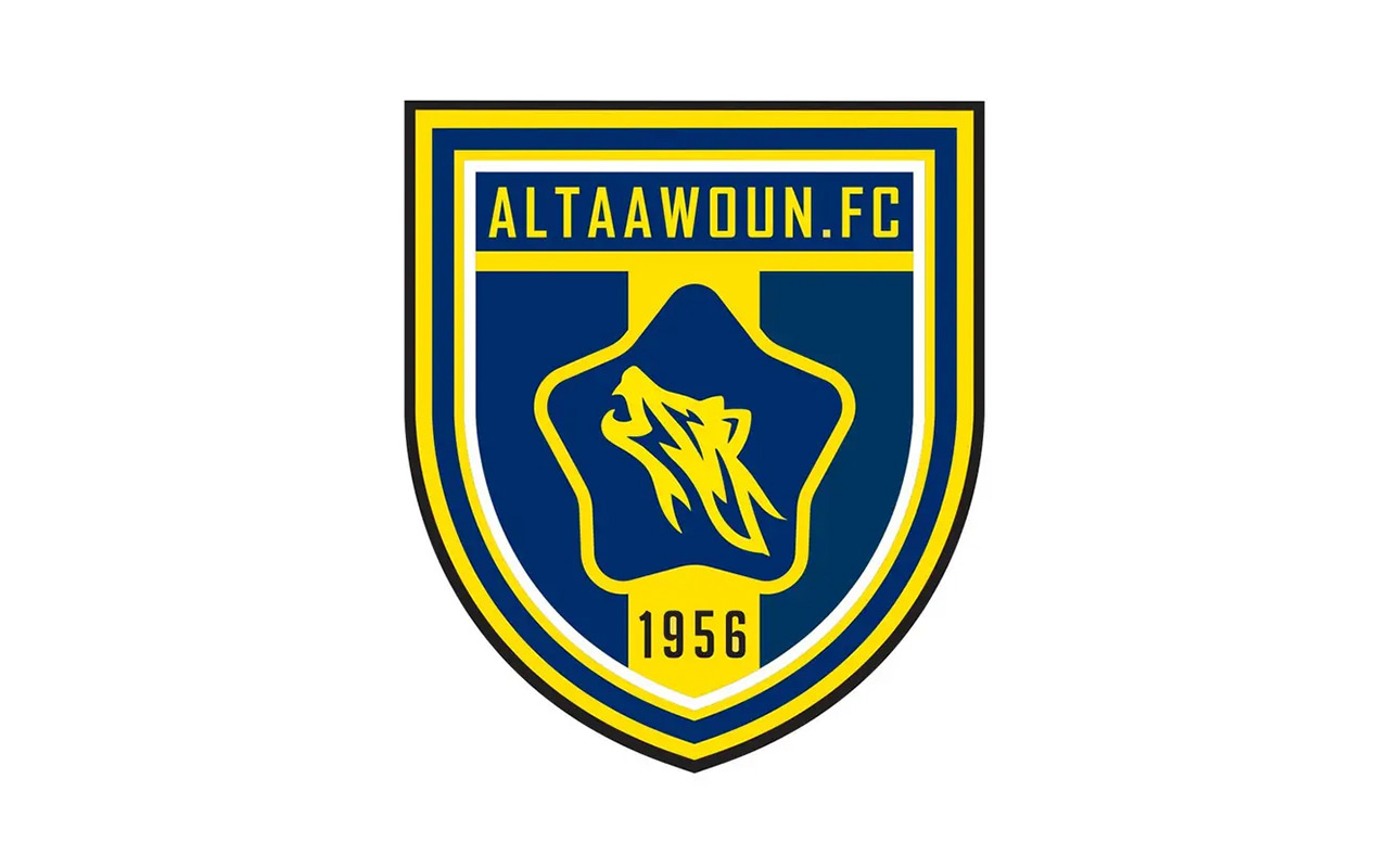 Al Taawoun Club distinctive logo is shaped like a shield with a wolf in the center, along with the club's name in English and the year of establishment. Yellow, blue, and black are characteristic colors of the club.