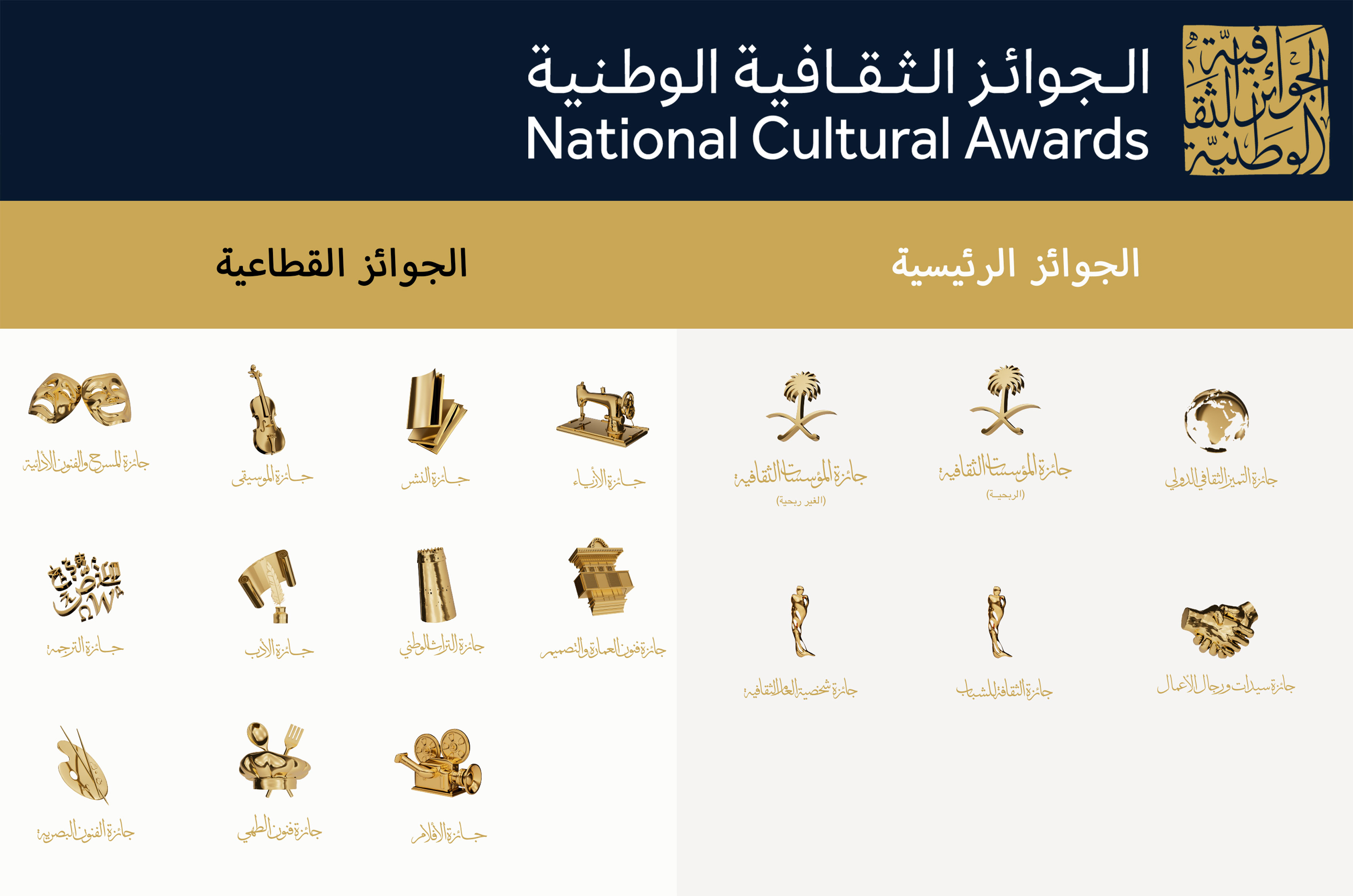 The Saudi National Cultural Awards included fourteen tracks in the first edition, which are: Cultural Personality of the Year Award, which is awarded to a Saudi figure with a prominent cultural role, contributing to a clear cultural movement; Youth Culture Award, which is awarded to citizens aged between twenty-one and forty, who have made a prominent cultural achievement during the two years prior to the launch of the award; Cultural Institutions Award; Film Award; Fashion Award; Music Award; National Heritage Award; Literature Award; Theater and Performing Arts Award; Visual Arts Award; Architecture and Design Award; Culinary Arts Award; Publishing Award; Translation Award.