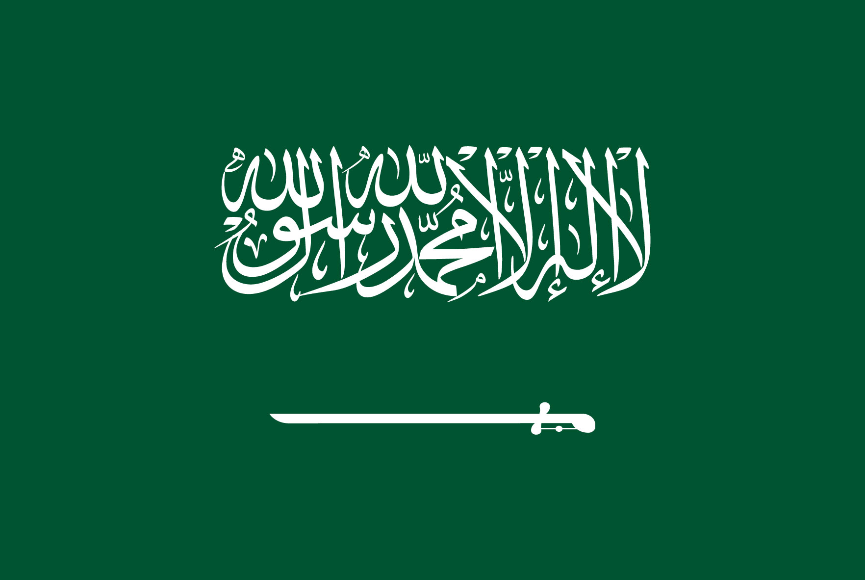 In 1986, the Minister of Interior issued a resolution regarding the standard specifications approved by the Saudi Arabian Organization for Standardization and Metrology for the national flag. In 1992, the Basic Law of Governance stipulated that the Saudi flag is green in color, with its width equal to two-thirds of its length. It bears the Shahada (There is no God but Allah) in the middle, with an unsheathed sword underneath it, and it should never be lowered at half-mast.